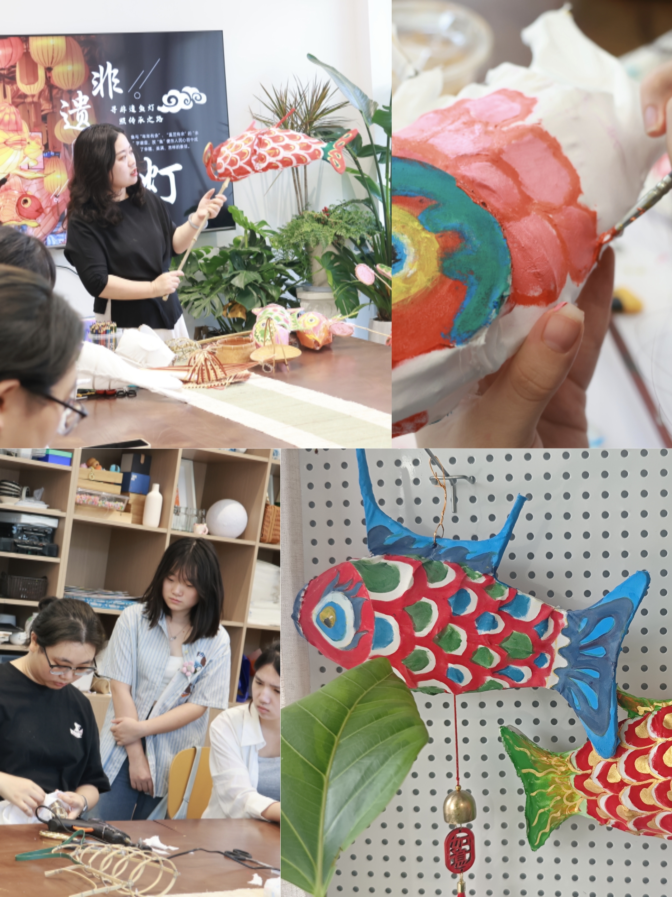 628日,团队来到广德市瑞园商业街迈田艺术空间,完成非遗鱼灯的后续制作。团队成员通过参与蒙布和彩绘等环节,对非遗文化有了更深刻的理解和感悟。在蒙布固定中,成员们小心翼翼,力求平整服帖地将绸布贴合在鱼灯竹骨上;在彩绘过程中,成员们精心调色、勾勒、填涂,一条条“鲤鱼”便鲜活起来。“看着鱼灯通过自己的双手一点点成型,仿佛能触摸到历史的温度,对中华优秀传统文化也有了更多的认识”团队成员电商法242余慧馨感慨道。