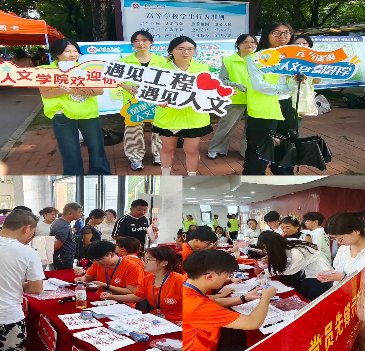 校园里,随处可见身着荧光绿马甲的志愿者忙碌的身影。他们是由“暖途”青年志愿者服务社、“阳光之旅” 青年志愿者服务队组成的迎新志愿服务队,从校门指引、行李搬运、报到流程讲解到宿舍安顿,提供“一站式”贴心服务。他们用热情的笑容和耐心的解答,消除了新生初来乍到的陌生与不安,用实际行动诠释了人文学院的互助精神与传承力量。与“荧光绿”相互呼应的是身着红色马甲、胸前佩戴党徽的“党员先锋示范岗”同学们。学生党员们亮明身份,值守在迎新关键点位,主动承担最繁重的任务,积极回应新生与家长的各类咨询,以高度的责任感和饱满的服务热情,展现了学生党员的先进性与担当精神,成为了迎新现场一道亮丽的风景线。