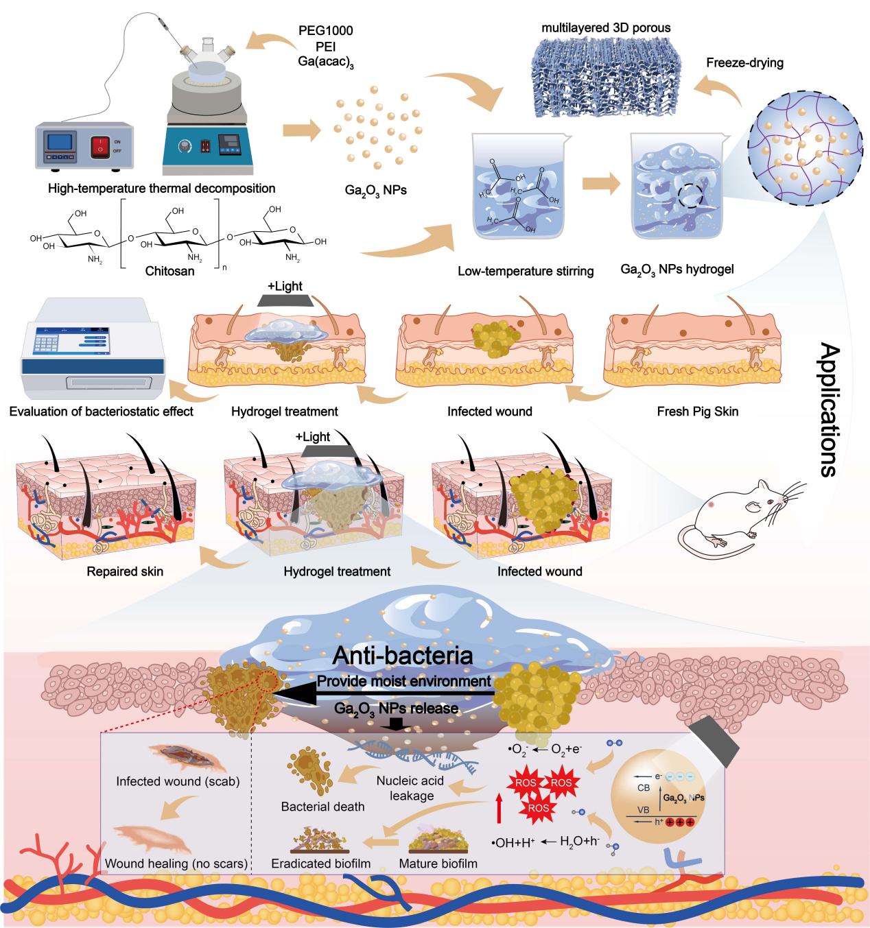 皮肤伤口易受细菌感染,尤其是耐药菌株的感染会显著延缓愈合进程。传统抗生素疗法面临耐药性挑战,而光催化抗菌疗法(PCAT)通过产生活性氧(ROS)杀灭细菌,具有广谱抗菌、不易耐药的优势,PCAT 利用水分子作为内源性物质,解决了缺氧细菌感染组织产生 ROS 的问题。然而,现有光催化材料在伤口环境中的稳定性、生物相容性及促愈合能力仍需优化。针对这一问题,研究团队通过高温热分解法合成氧化镓纳米颗粒(Ga2O3 NPs),并将其与壳聚糖水凝胶交联,构建了具有多层3D多孔结构的光响应性水凝胶(Ga2O3 NPs hydrogel。在可见光照射下,Ga2O3 NPs通过光催化作用能够高效产生ROS,破坏细菌细胞膜并诱导核酸泄漏,从而杀灭细菌。此外,水凝胶的湿润环境为伤口愈合提供了理想条件,加速表皮细胞迁移和胶原沉积,显著减少疤痕形成。