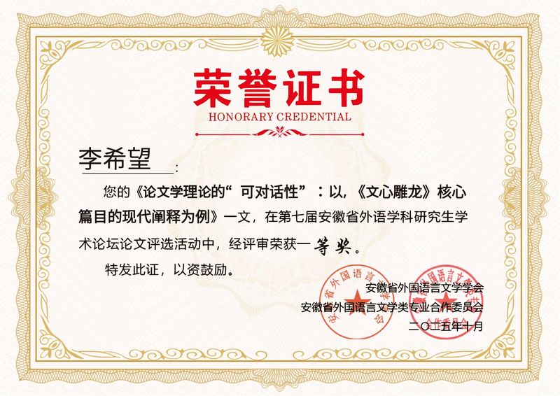 1025日,由安徽省外国语言文学学会、安徽省外国语言文学类专业合作委员会主办和安徽理工大学外国语学院承办的第七届安徽省外语学科研究生学术论坛在淮南市隆重举行。我校应用化学222的李希望同学和土木工程231的井国瑞同学在论坛的论文评比和汇报交流环节宣读论文,并分别荣获一等奖和三等奖优秀论文,论文指导教师为外国语学院朱莉教授。